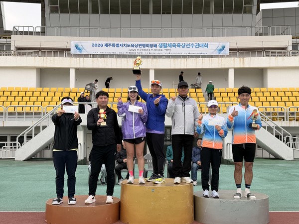 24일 제주도 육상계에 따르면 지난 22일 제주종합경기장 주경기장에서 열린 ‘2026 제주특별자치도육상연맹회장배 전도마스터즈육상선수권대회 겸 전국생활대축전 제주대표 선발전’에서 달리기제주인클럽은 금메달 22개, 은메달 12개, 동메달 11개 등 모두 45개의 메달을 쓸어 담으며 압도적인 종합 1위를 차지했다.